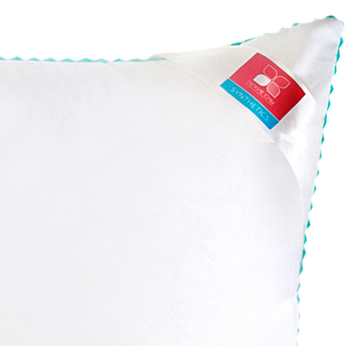 Важно заметить, что синтетический пух столь же лёгок и приятен на ощупь, как и его натуральный прототип. Чехол подушки выполнен из микрофибры (100 % полиэстр) белого цвета с тиснением страйп или волны, отделка по краю подушки кантом зиг-заг бирюзового цвета, фирменная упаковка конверт ПВД, спанбонд.